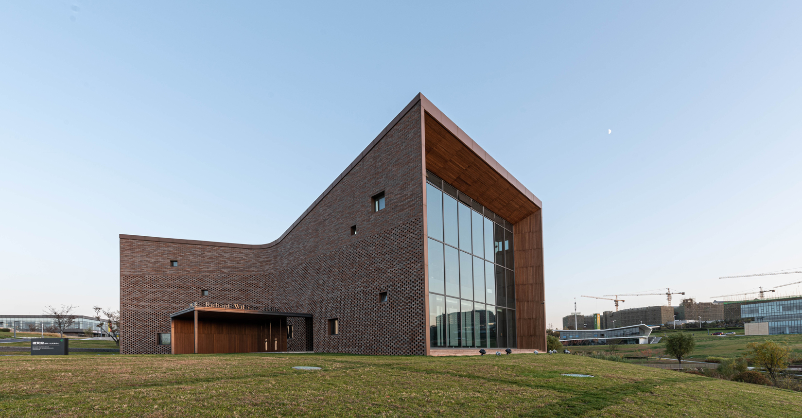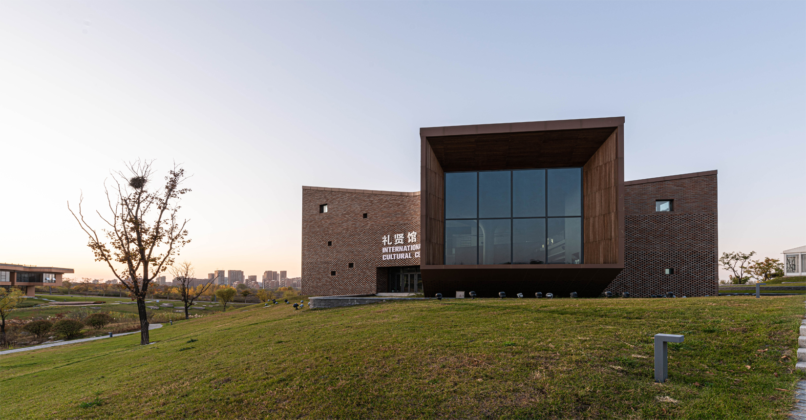 建筑南側(cè)設(shè)置次要出入口,并與水流形成互動。建筑立面材質(zhì)采用精致的磚材拼面,屋頂采用微微揚(yáng)起的處理手法;穩(wěn)重且不失變化。