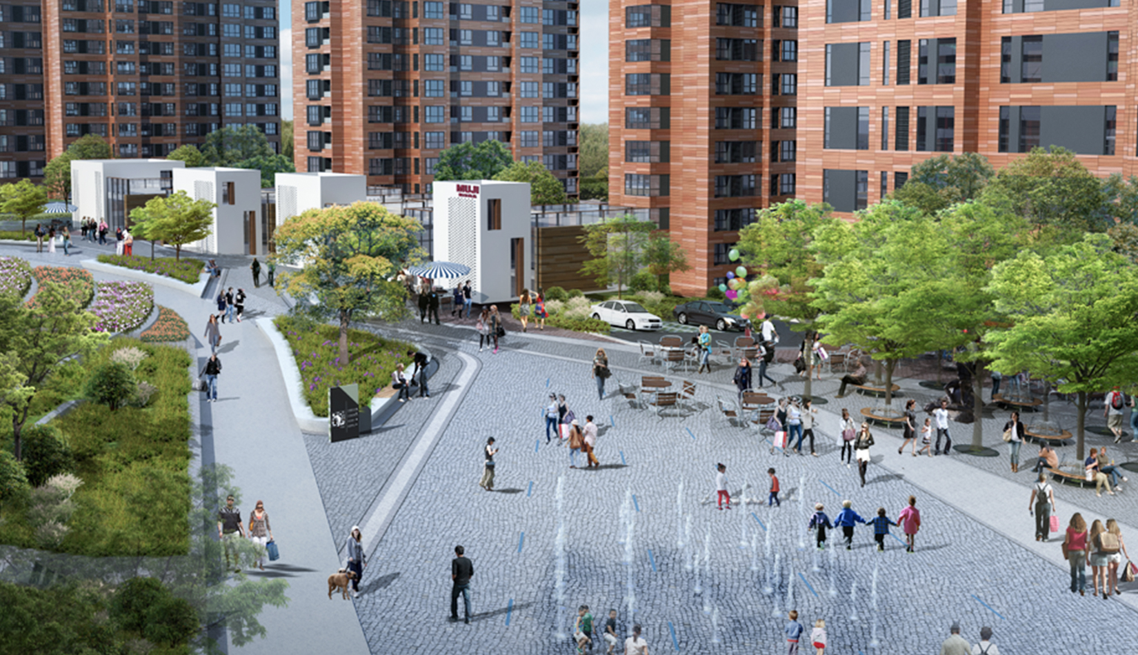 結(jié)合高差設(shè)計(jì)的中央景觀軸線,設(shè)計(jì)需呼應(yīng)貫通,通過多軸手法形成豐富的景觀效果。自然的斜坡,景觀臺(tái)階,階梯式草坪等多種建筑景觀手段與之相映成趣。