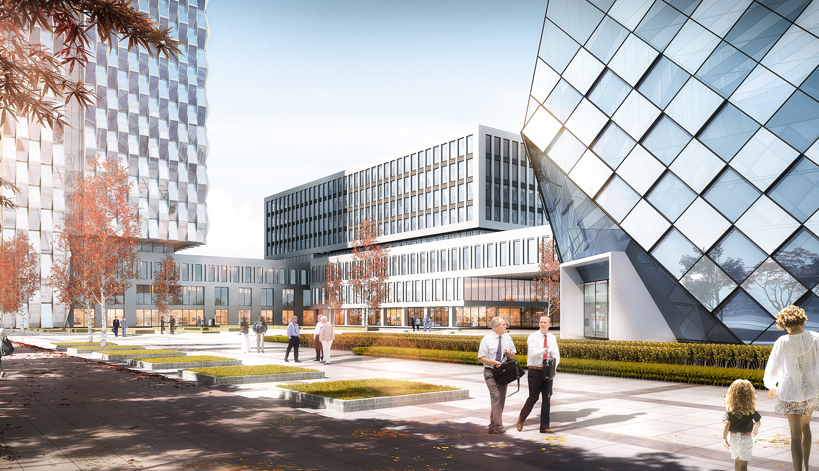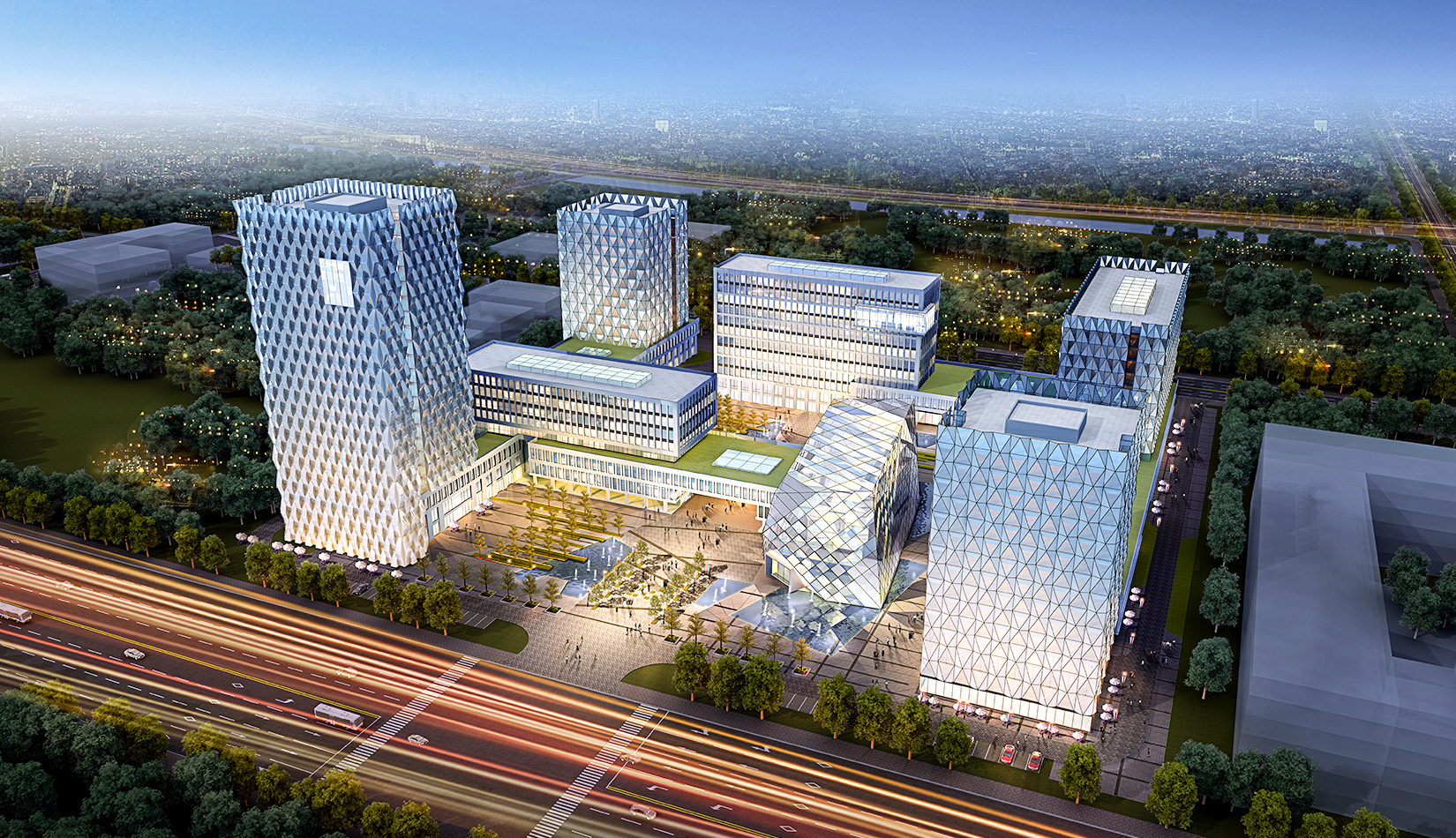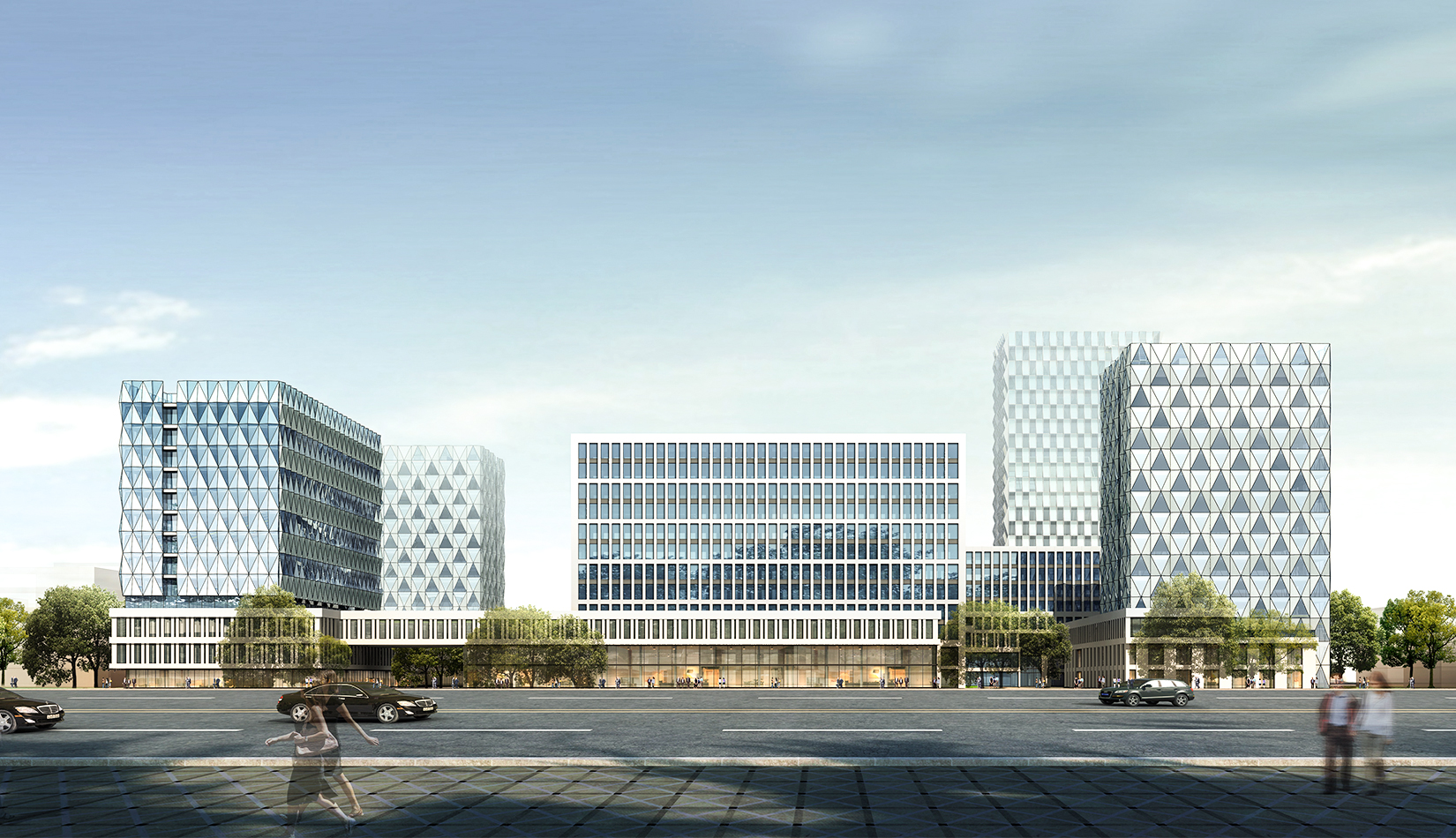 建筑立面風格現(xiàn)代簡潔,高層塔樓以玻璃與金屬幕墻為主,塑造其硬朗簡潔的建筑性格,內(nèi)部兩棟建筑采用格構(gòu)式立面風格,同樣以簡潔為設計原則,展現(xiàn)其富有理性秩序的立面形象。