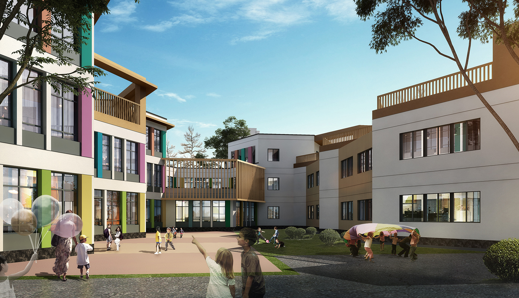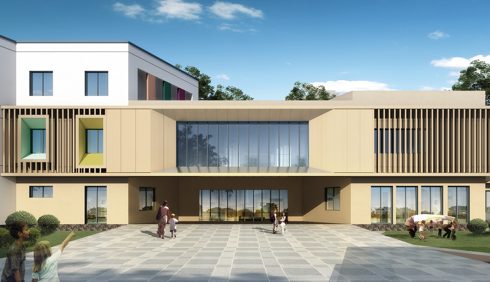 整體建筑以暖色調(diào)為主,旨在為幼兒營造一種溫馨的環(huán)境氛圍,以紅色陶土板為基調(diào),與周邊古典風(fēng)格的住宅區(qū)相融合。彩色的運用象征著孩子活潑多彩的個性,迎合了孩子對色彩的敏感特性,營造出一種五彩斑斕的活潑的環(huán)境氛圍;彩色具有強調(diào)作用,可以突出建筑作為幼兒園的功能性,同時白色作為整體環(huán)境的基調(diào)色,協(xié)調(diào)了不同色彩間的沖突感受,使建筑氛圍呈現(xiàn)簡潔明凈而又突顯夢幻的特點。