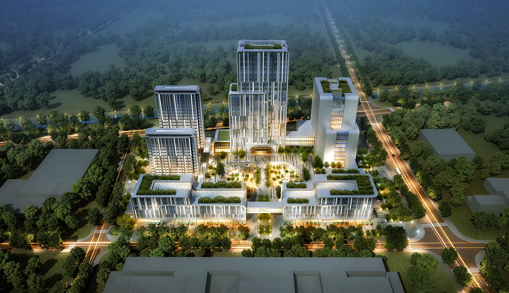 建筑圍合共享的中間庭院,庭院采用新中式風(fēng)格,屋頂設(shè)計屋頂花園,靜謐淡雅,為人們提供一個安靜休憩空間。