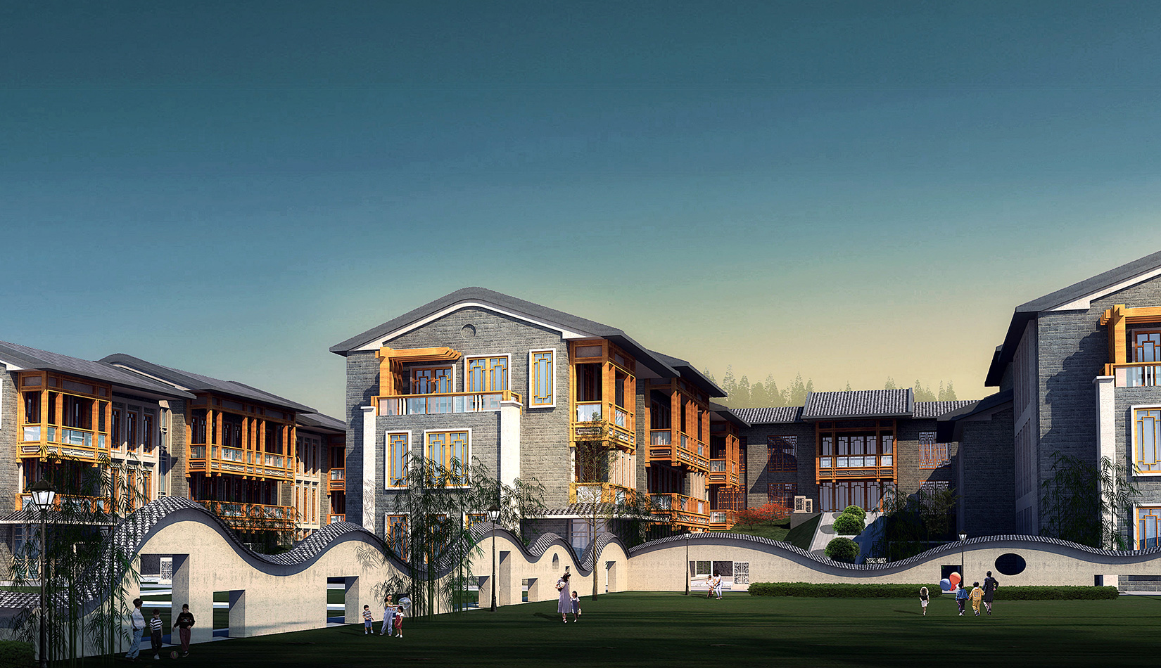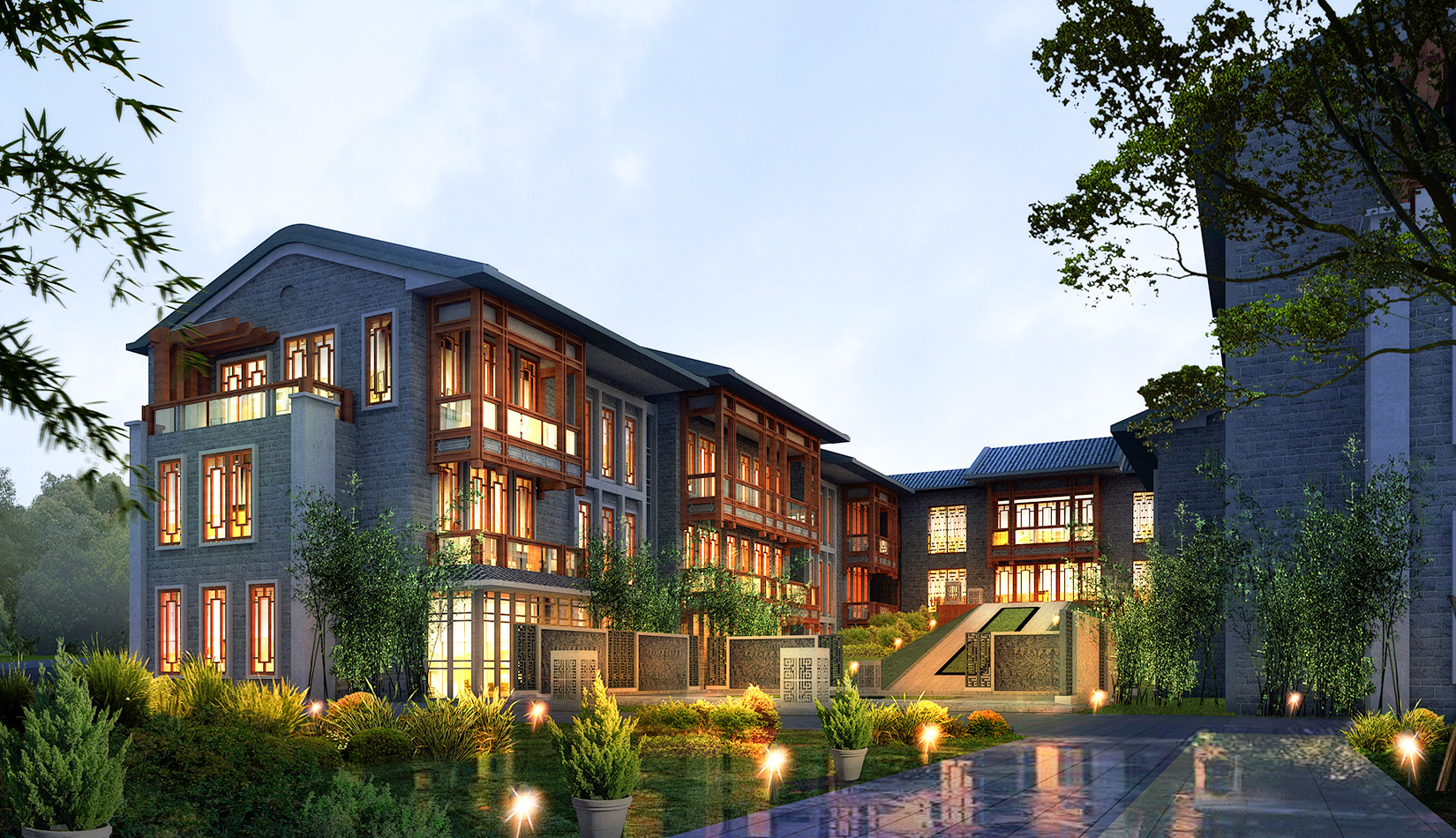 建筑造型采用中國(guó)古典建筑形式,立面符號(hào)提煉古典的建筑符號(hào),努力營(yíng)造出中國(guó)傳統(tǒng)私塾的學(xué)院派的風(fēng)格。