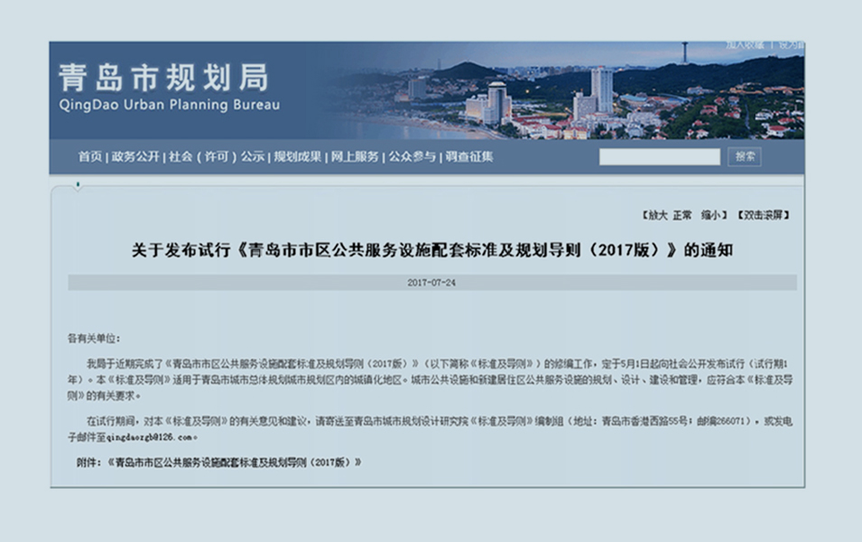 • 《青島市市區(qū)公共服務(wù)設(shè)施配套標(biāo)準(zhǔn)及規(guī)劃導(dǎo)則》 修編